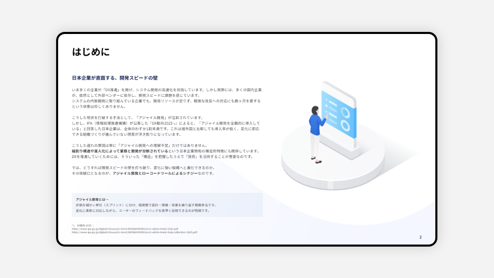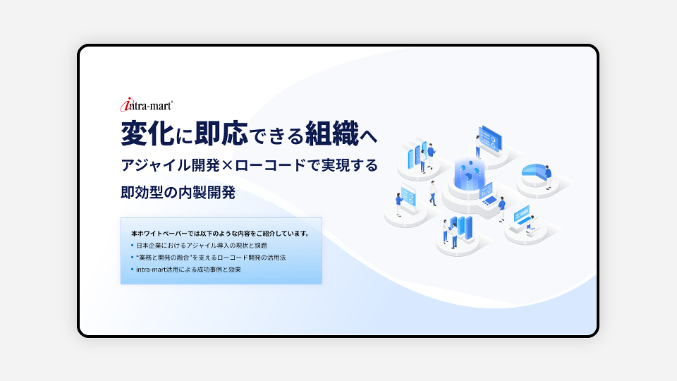 本資料では・⽇本企業におけるアジャイル導⼊の現状と課題・業務と開発の融合”を⽀えるローコード開発の活⽤法・intra-mart活⽤による成功事例と効果以上のような内容をご紹介しています。
