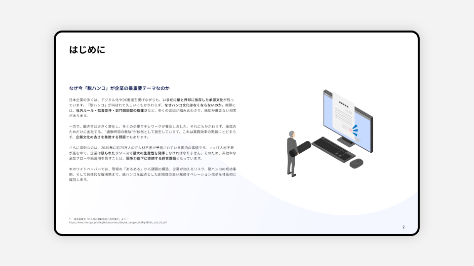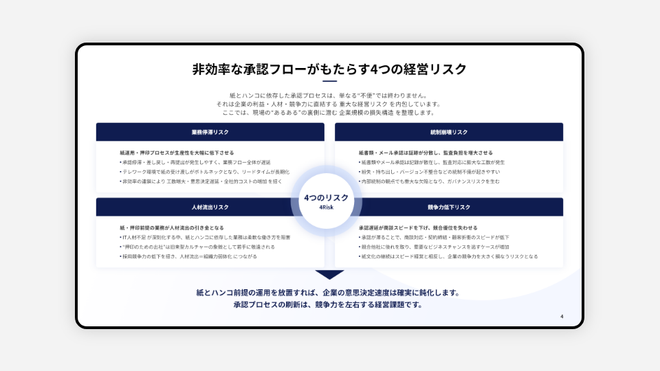 本資料では、現場の「あるある」から課題の構造、企業が抱えるリスク、脱ハンコの成功事例、そして具体的な解決策まで、脱ハンコを起点とした即効性の⾼い業務オペレーション改⾰を体系的に解説します。