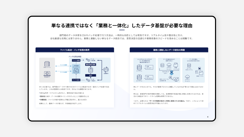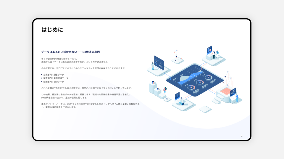 多くの企業がDX推進を掲げる一方で、現場からは「データはあるのに活用できない」という声が絶えません。その背景には、部門ごとにバラバラのシステムやデータ管理が存在することがあります。本ホワイトペーパーでは、この“サイロ化の壁”を打破するための「リアルタイム統合基盤」の構築方法と、実際の成功事例をご紹介します。
