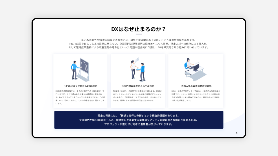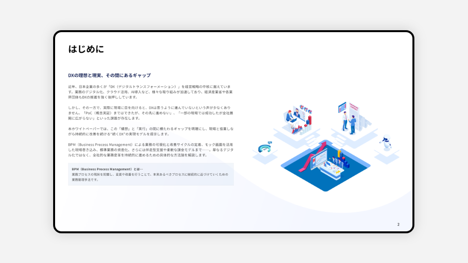 近年、日本企業の多くが「DX」を経営戦略の中核に据えています。一方で、実際に現場に目を向けると、DXは思うように進んでいないという声が少なくありません。本ホワイトペーパーでは、現場と協業しながら持続的に改善を続ける“続くDX”の実現モデルを提示し、単なるデジタル化ではなく、全社的な業務変革を持続的に進めるための具体的な方法論を解説します。