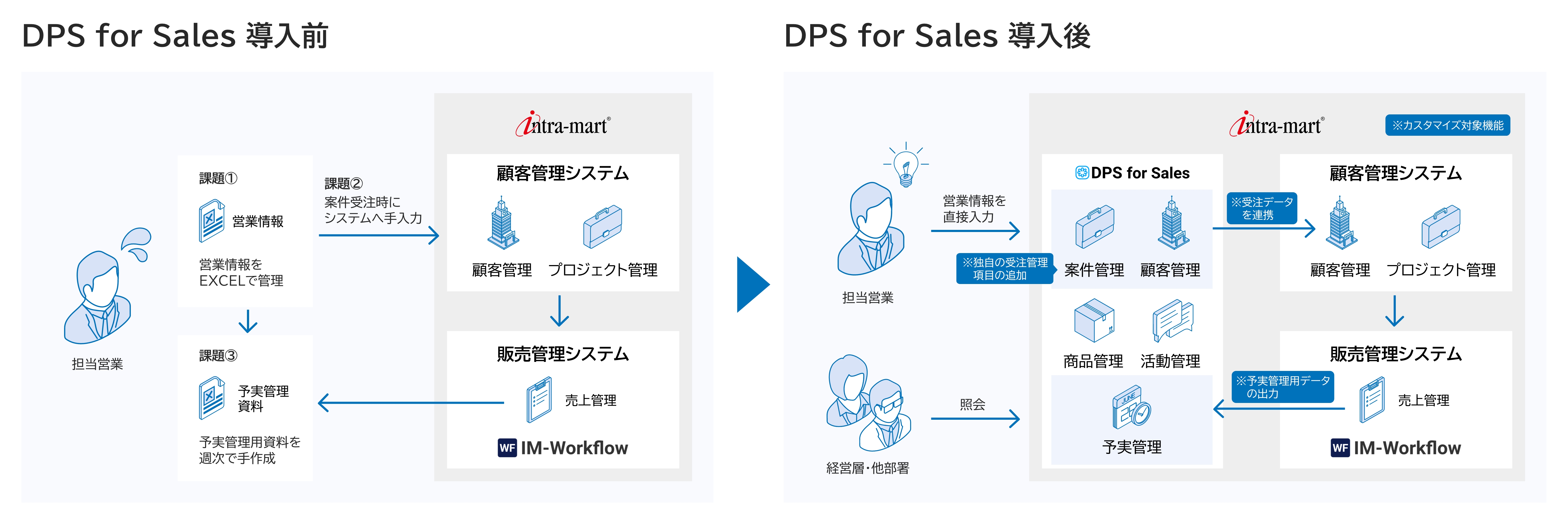 ※1: DPS for Salesは、顧客接点領域からバックオフィス業務につながる全ての業務プロセスをデジタル化・自動化し、属人化の解消や業務効率・顧客エンゲージメントを向上させるイントラマートの総合ソリューション「intra-mart DPS(Digital Process Solutions)」のラインナップの一つです。
